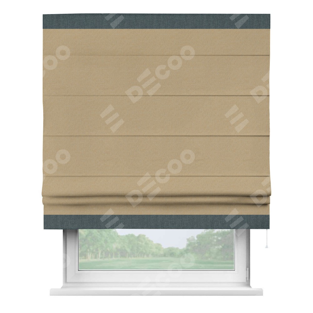 Римская штора производителя «Cortin», используется для проёма, пошита из ткани лён димаут тёмно-бежевый, артикул 83037. Отделка шторы кантом «Горизонт», ткань для канта используется из льна димаут разной расцветки на выбор. Имеет универсальный механизм и подходит для монтажа: на потолок, на стену и в нишу.