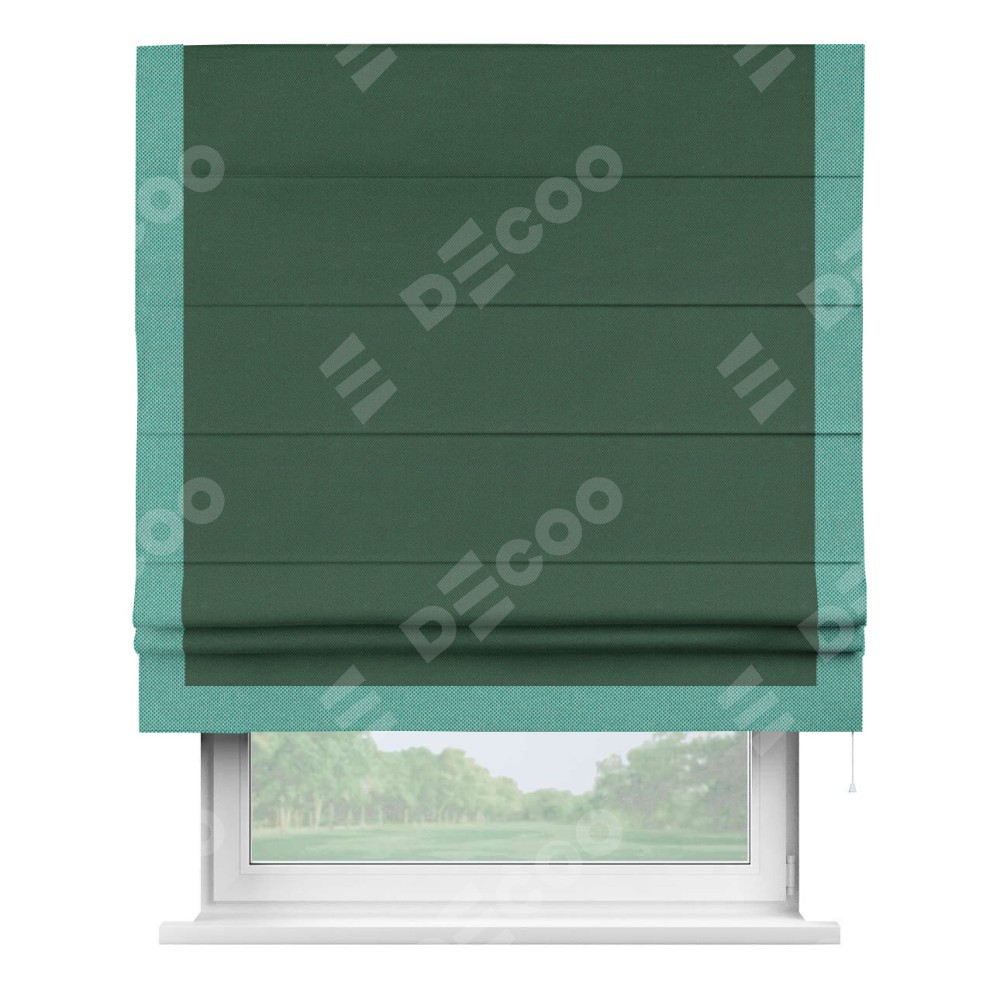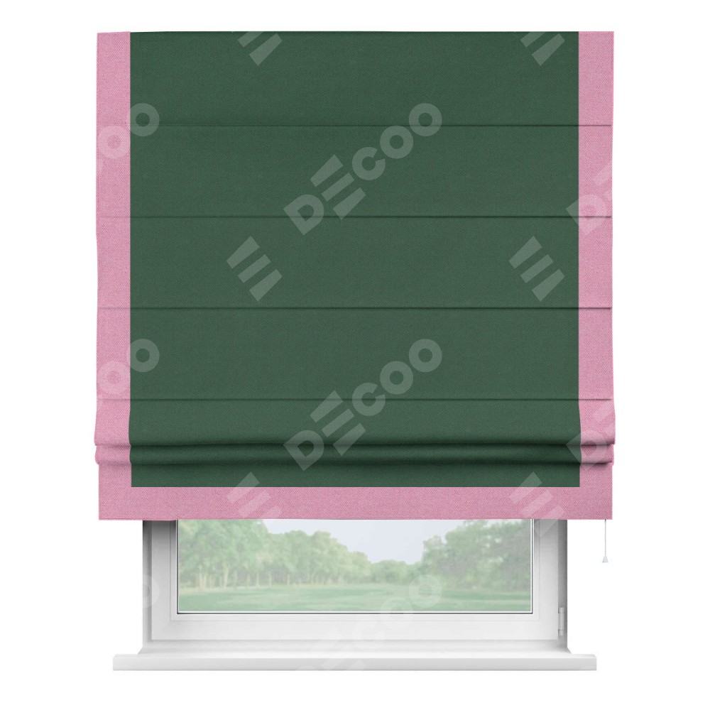 Римская штора производителя «Cortin», используется для проёма, пошита из ткани лён димаут тёмно-зелёный, артикул 16246. Отделка шторы кантом «Виктория», ткань для канта используется из льна димаут разной расцветки на выбор. Имеет универсальный механизм и подходит для монтажа: на потолок, на стену и в нишу.