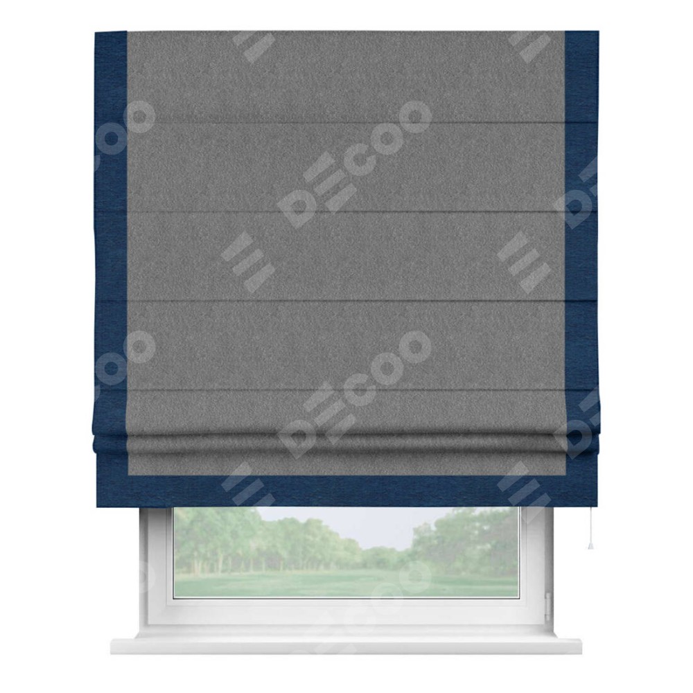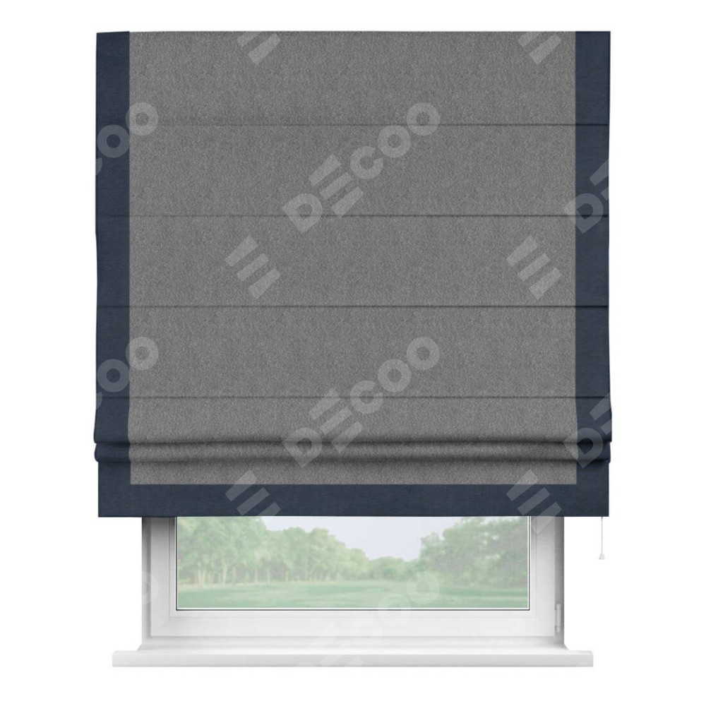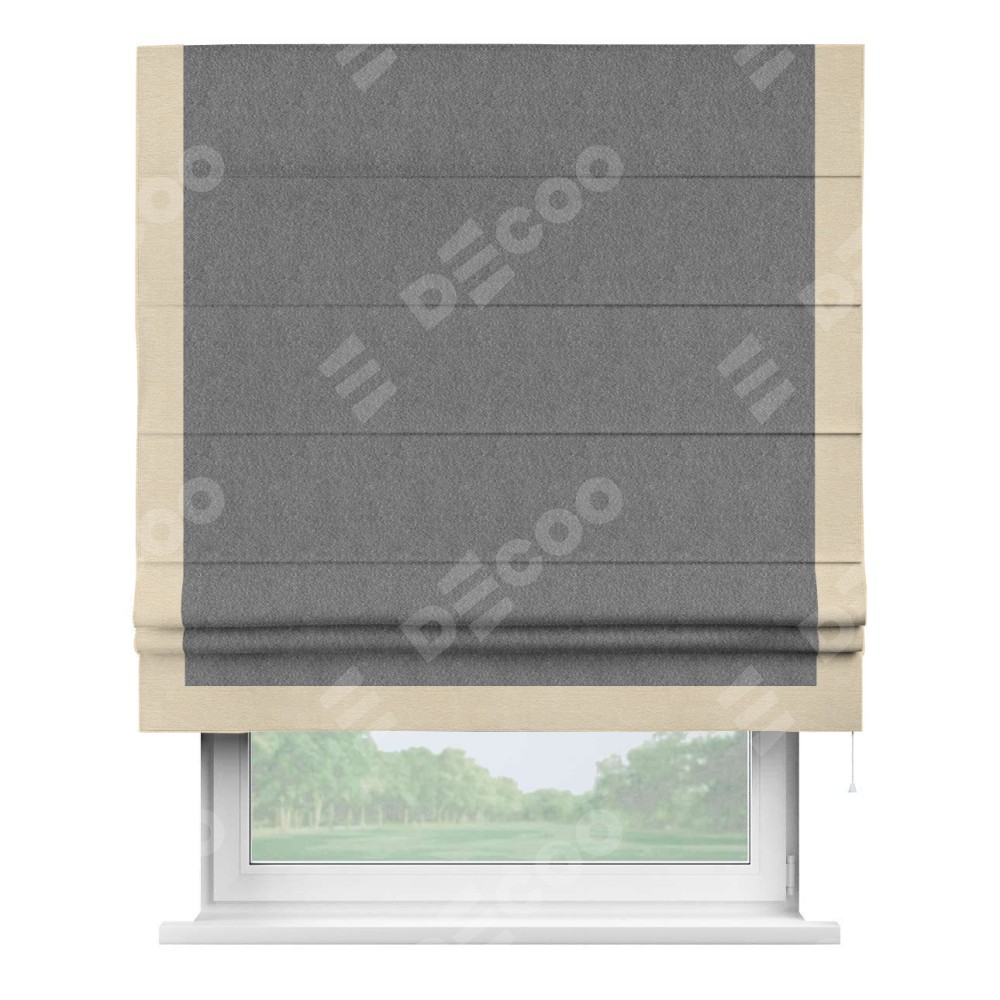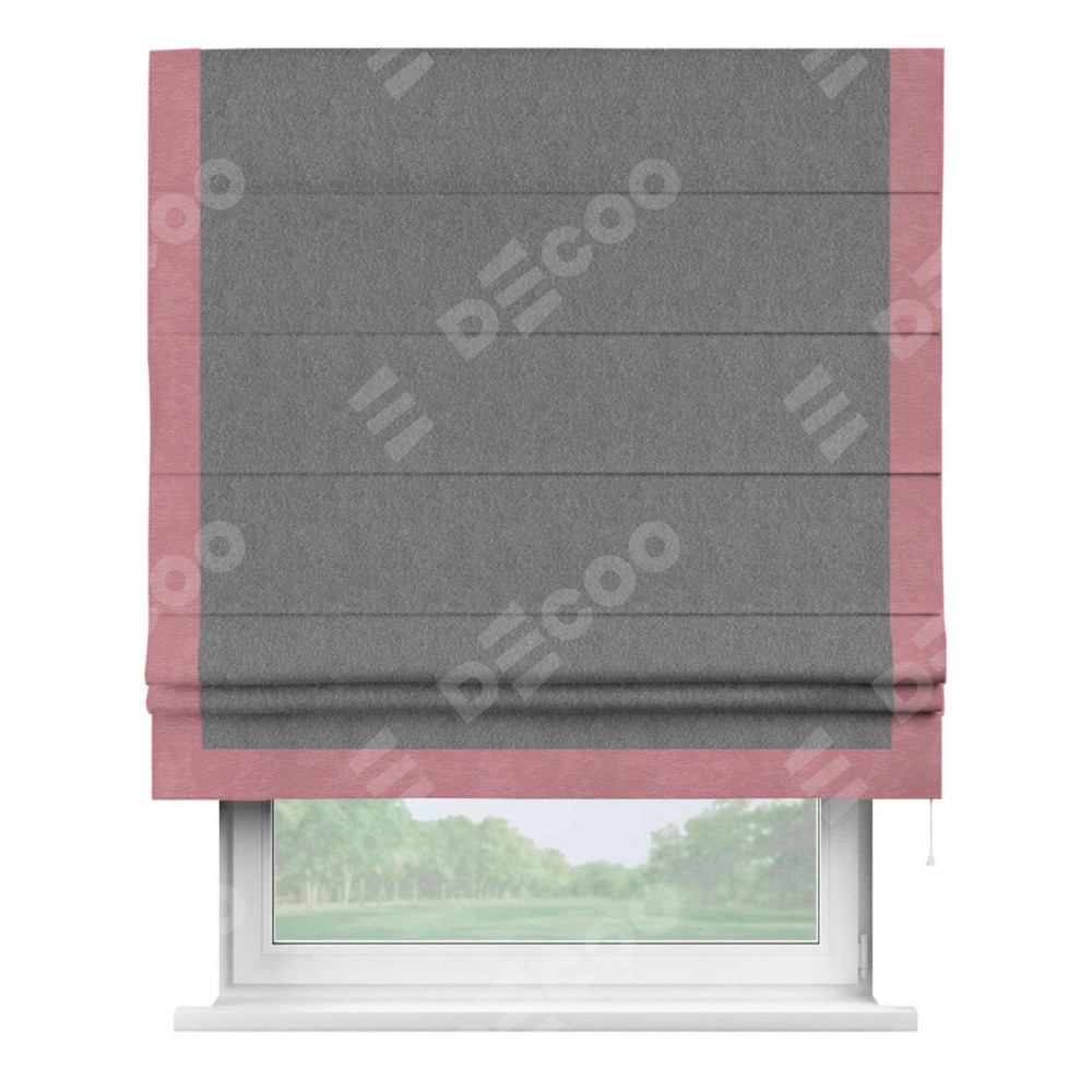 Римская штора производителя «Cortin», используется для проёма, пошита из ткани софт однотонный серый, артикул 70605. Отделка шторы кантом «Виктория», ткань для канта используется из софта разной расцветки на выбор. Имеет универсальный механизм и подходит для монтажа: на потолок, на стену и в нишу.