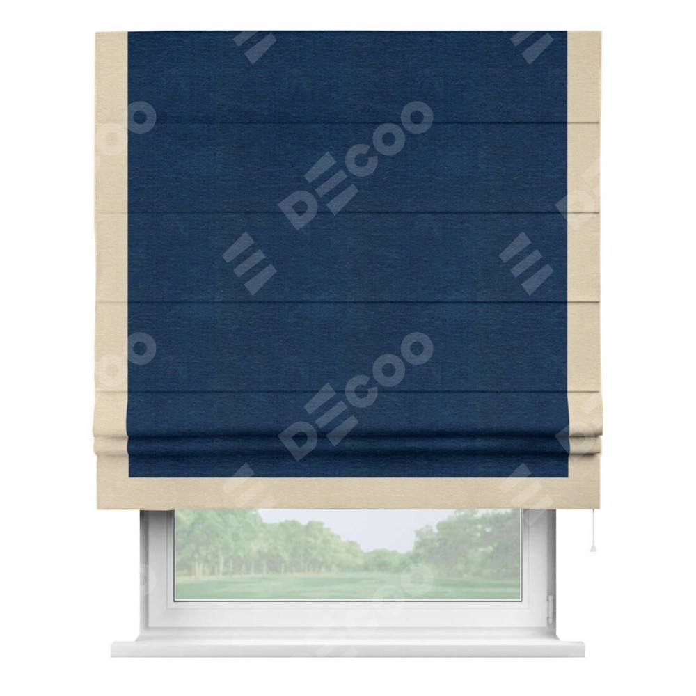 Римская штора производителя «Cortin», используется для проёма, пошита из ткани софт однотонный синий, артикул 42937. Отделка шторы кантом «Виктория», ткань для канта используется из софта разной расцветки на выбор. Имеет универсальный механизм и подходит для монтажа: на потолок, на стену и в нишу.