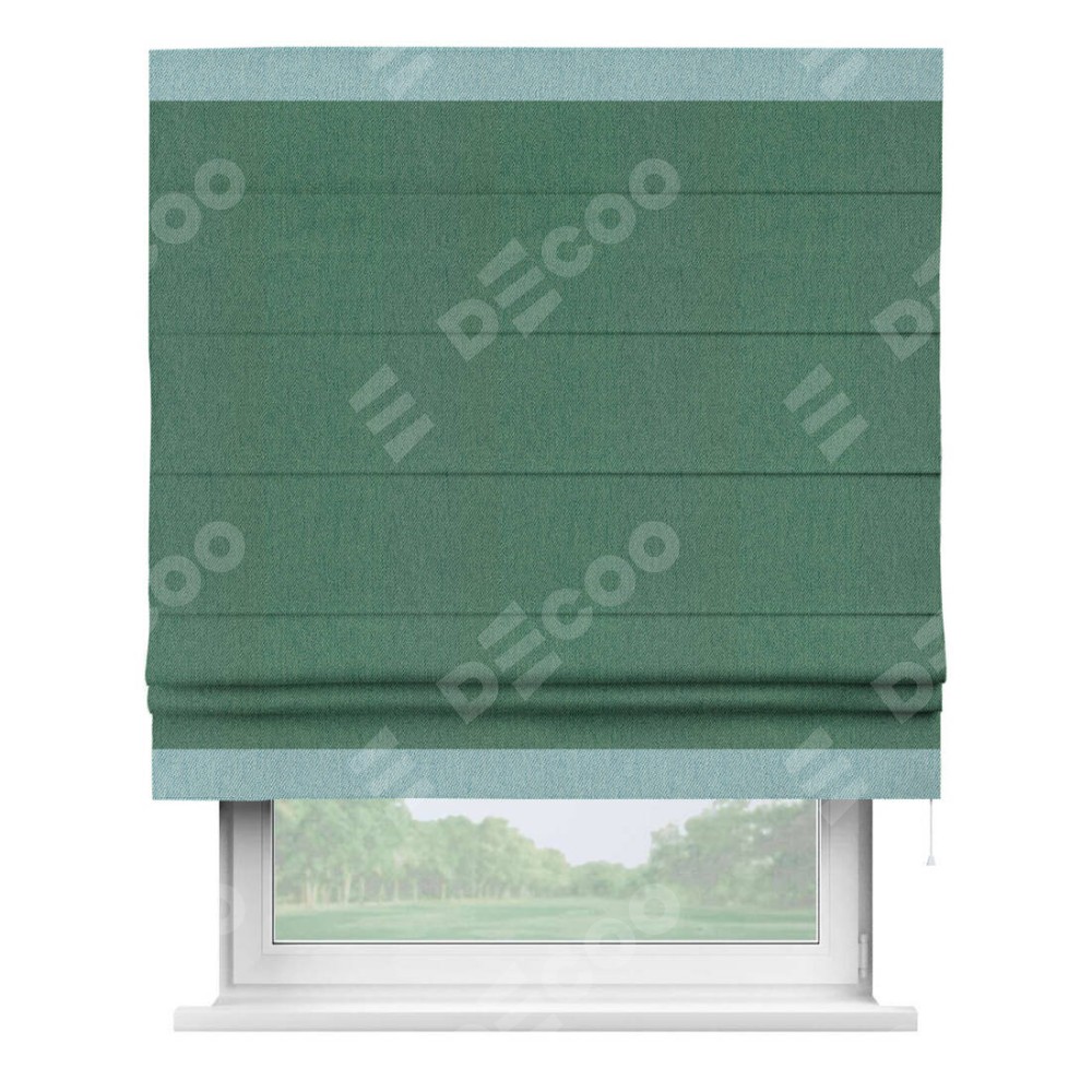 Римская штора производителя «Cortin», используется для проёма, пошита из ткани твид блэкаут зелёный, артикул 21589. Отделка шторы кантом «Горизонт», ткань для канта используется из твида разной расцветки на выбор. Имеет универсальный механизм и подходит для монтажа: на потолок, на стену и в нишу.