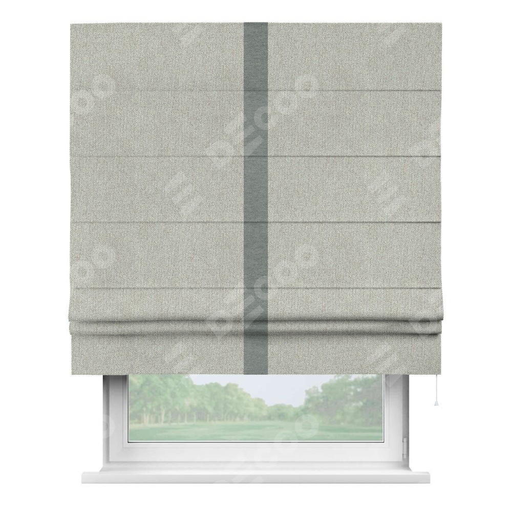 Римская штора производителя «Cortin», используется для проёма, пошита из ткани твид блэкаут коричнево-серый, артикул 21574. Отделка шторы кантом «Хайвэй», ткань для канта используется из твида разной расцветки на выбор. Имеет универсальный механизм и подходит для монтажа: на потолок, на стену и в нишу.