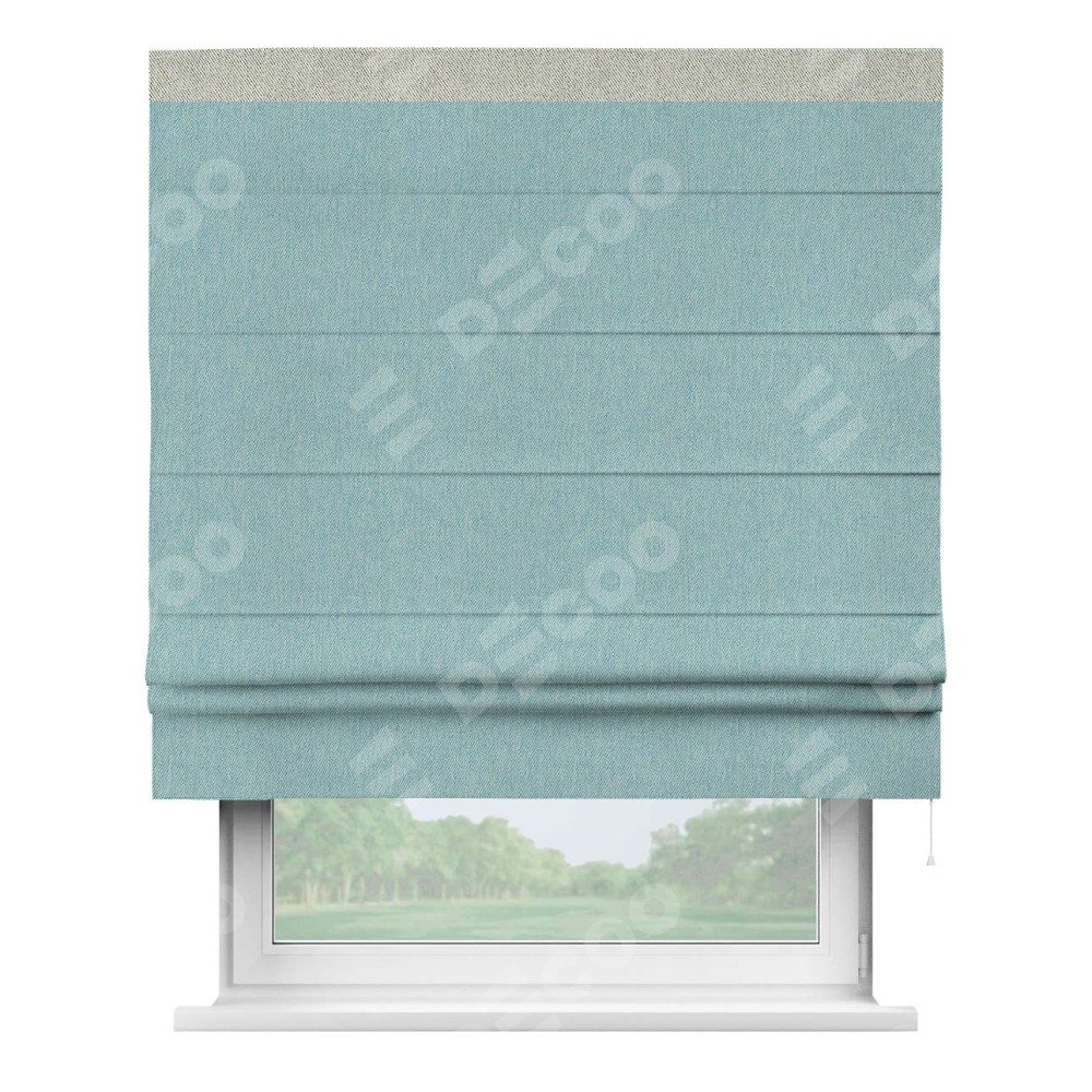 Римская штора производителя «Cortin», используется для проёма, пошита из ткани твид блэкаут небесно-голубой, артикул 21578. Отделка шторы кантом «Кинг», ткань для канта используется из твида разной расцветки на выбор. Имеет универсальный механизм и подходит для монтажа: на потолок, на стену и в нишу.