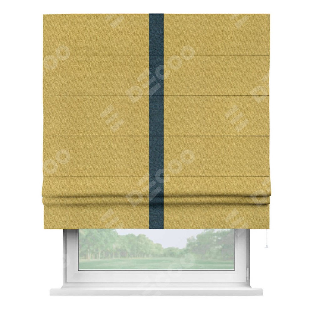 Римская штора производителя «Cortin», используется для проёма, пошита из ткани твид блэкаут пыльная горчица, артикул 21588. Отделка шторы кантом «Хайвэй», ткань для канта используется из твида разной расцветки на выбор. Имеет универсальный механизм и подходит для монтажа: на потолок, на стену и в нишу.