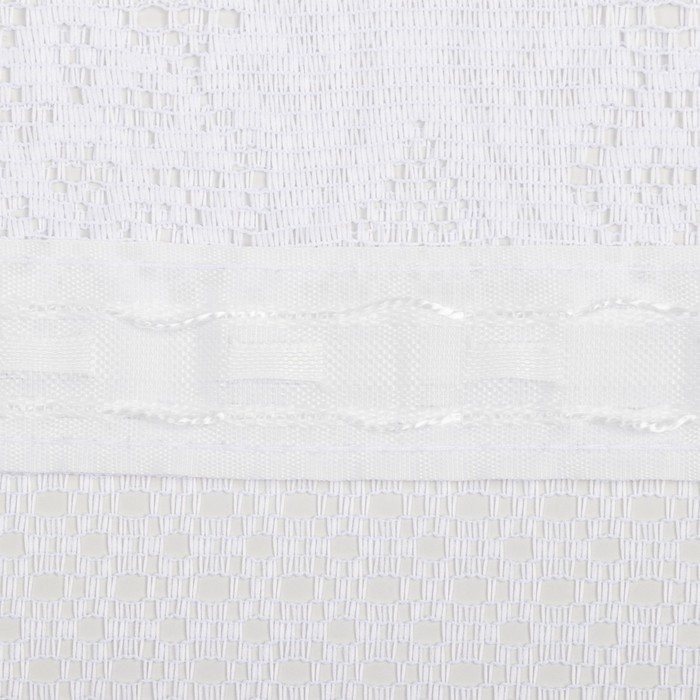 Тюль кухонная со шторной лентой, 285×165 см, белый, 100% п/э сделает внешний вид обеденной зоны полным и законченным. Изящное оформление в виде причудливых узоров подчеркнёт ваш изысканный стиль и утончённый вкус.