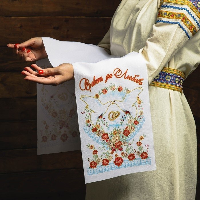 Рушник под ноги. Кто первым из молодых на него встанет — тому и быть хозяином в доме. Лучше отказаться от вариантов, на которых изображена пара голубей или лебедей, а также кольца. Считается, что супруги могут затоптать своё счастье. Лучше отдать предпочтение геометрическим или растительным узорам.