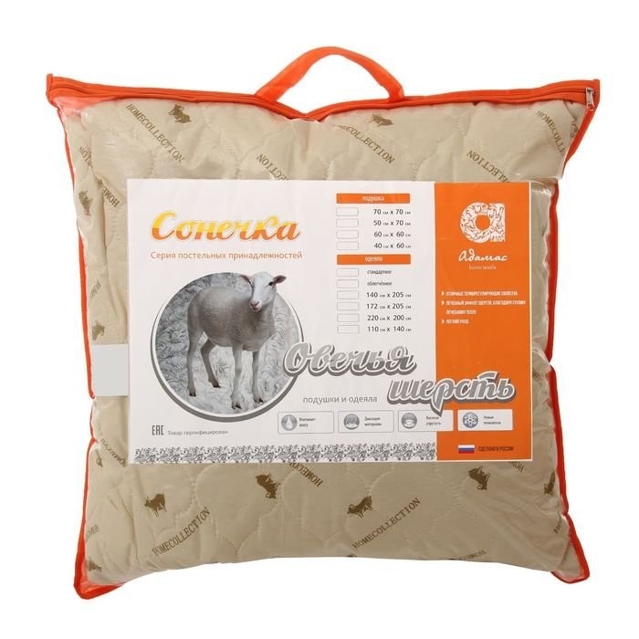Подушка Адамас Сонечка Овечья шерсть 70*70см, чехол полиэстер, сумка
