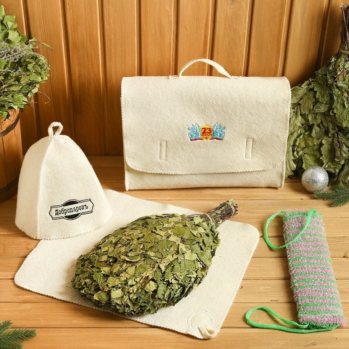 Для комфортного отдыха в парной возьмите с собой набор банных принадлежностей. Предметы из этого комплекта предохраняют тело от перегрева и являются средствами индивидуального пользования. Влажные изделия рекомендуется сушить в расправленном виде на горизонтальной поверхности. Принадлежности из войлока и фетра стирайте вручную при температуре воды 30 °C.