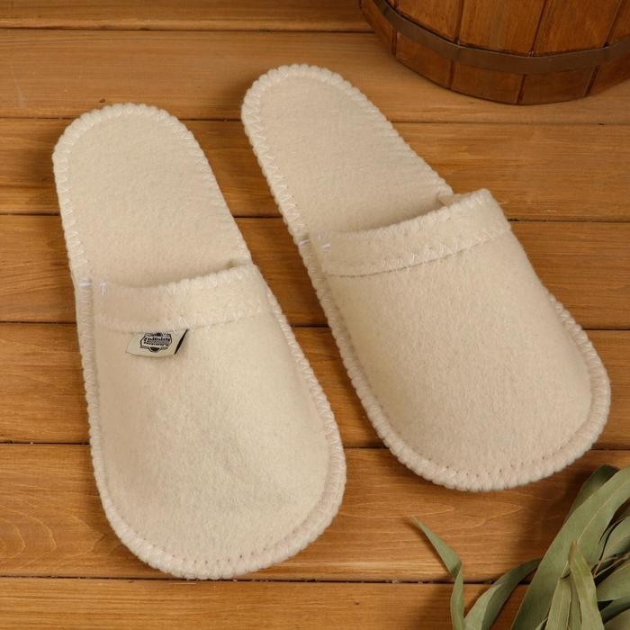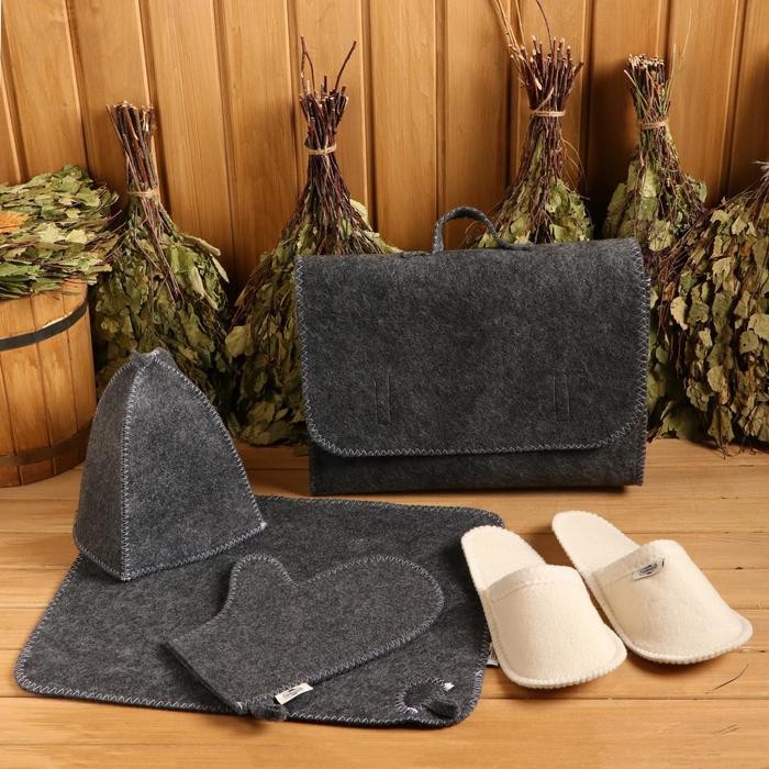 Тапочки из войлока и коврик впитывают влагу и сохраняют сухость, что обеспечивает комфорт во время посещения парной.
