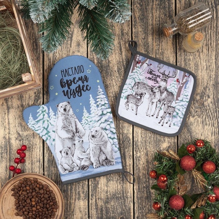 Набор кухонный «Время чудес» варежка-прихватка 20х28см, прихватка 17×17 35% хл,65% п/э