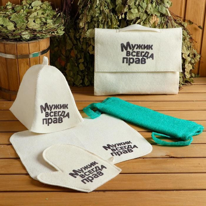 Для комфортного отдыха в парной возьмите с собой набор банных принадлежностей. Предметы из этого комплекта предохраняют тело от перегрева и являются средствами индивидуального пользования. Влажные изделия рекомендуется сушить в расправленном виде на горизонтальной поверхности. Принадлежности из войлока и фетра стирайте вручную при температуре воды 30 °C.