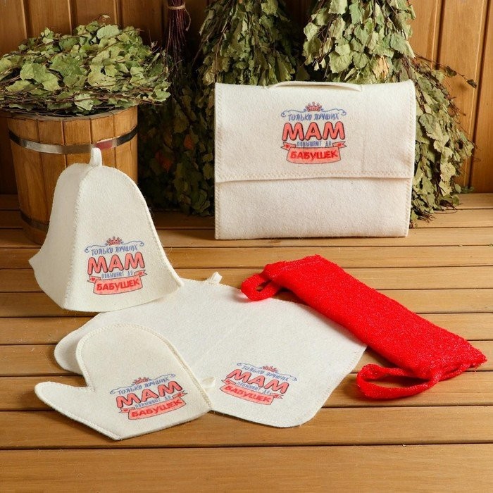 Для комфортного отдыха в парной возьмите с собой набор банных принадлежностей. Предметы из этого комплекта предохраняют тело от перегрева и являются средствами индивидуального пользования. Влажные изделия рекомендуется сушить в расправленном виде на горизонтальной поверхности. Принадлежности из войлока и фетра стирайте вручную при температуре воды 30 °C.