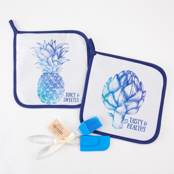 В набор входит 2 прихватки 19 × 19 см, силиконовые лопатка и кисточка.